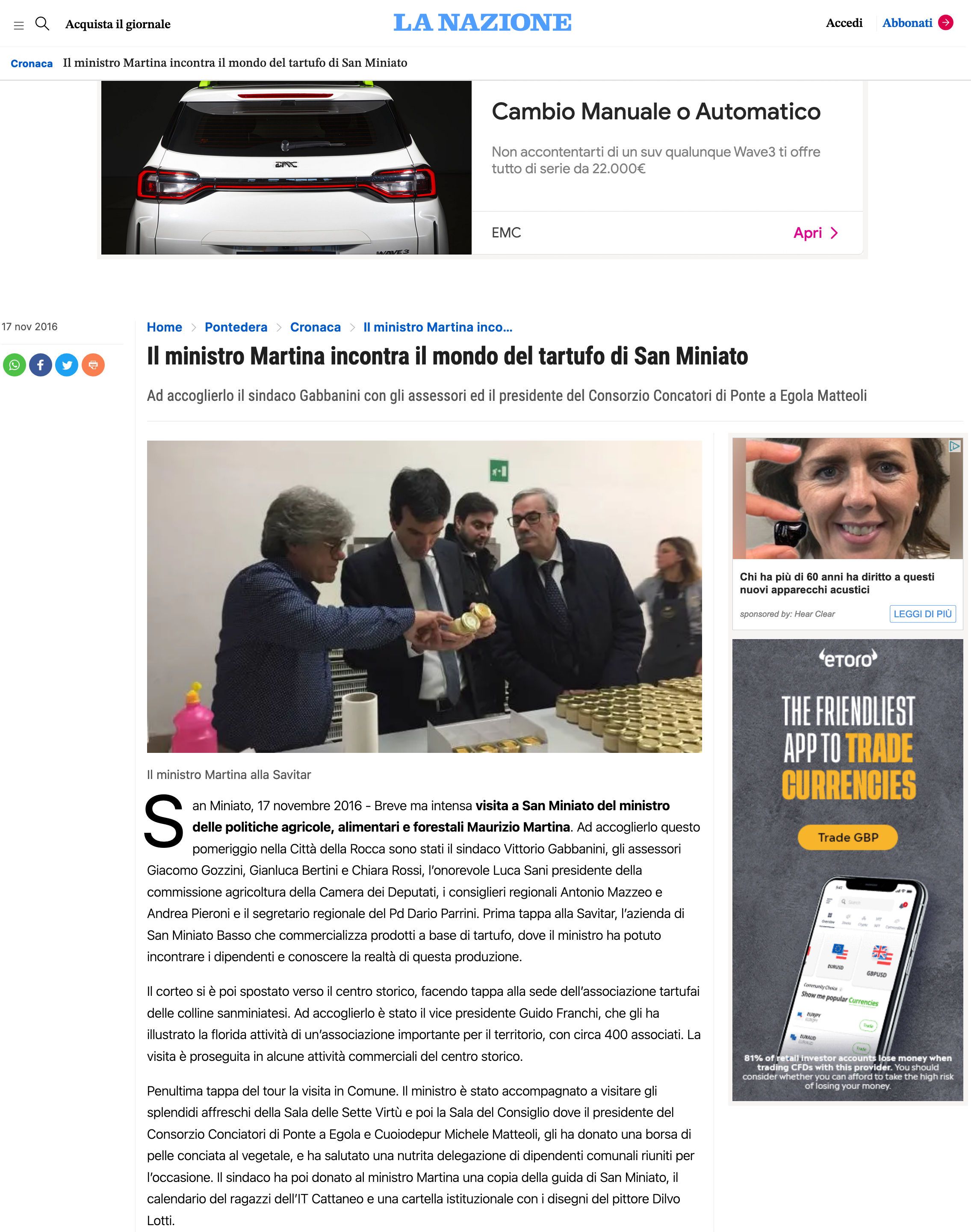 Il ministro Martina incontra il mondo del tartufo di San Miniato Ad accoglierlo il sindaco Gabbanini con gli assessori ed il presidente del