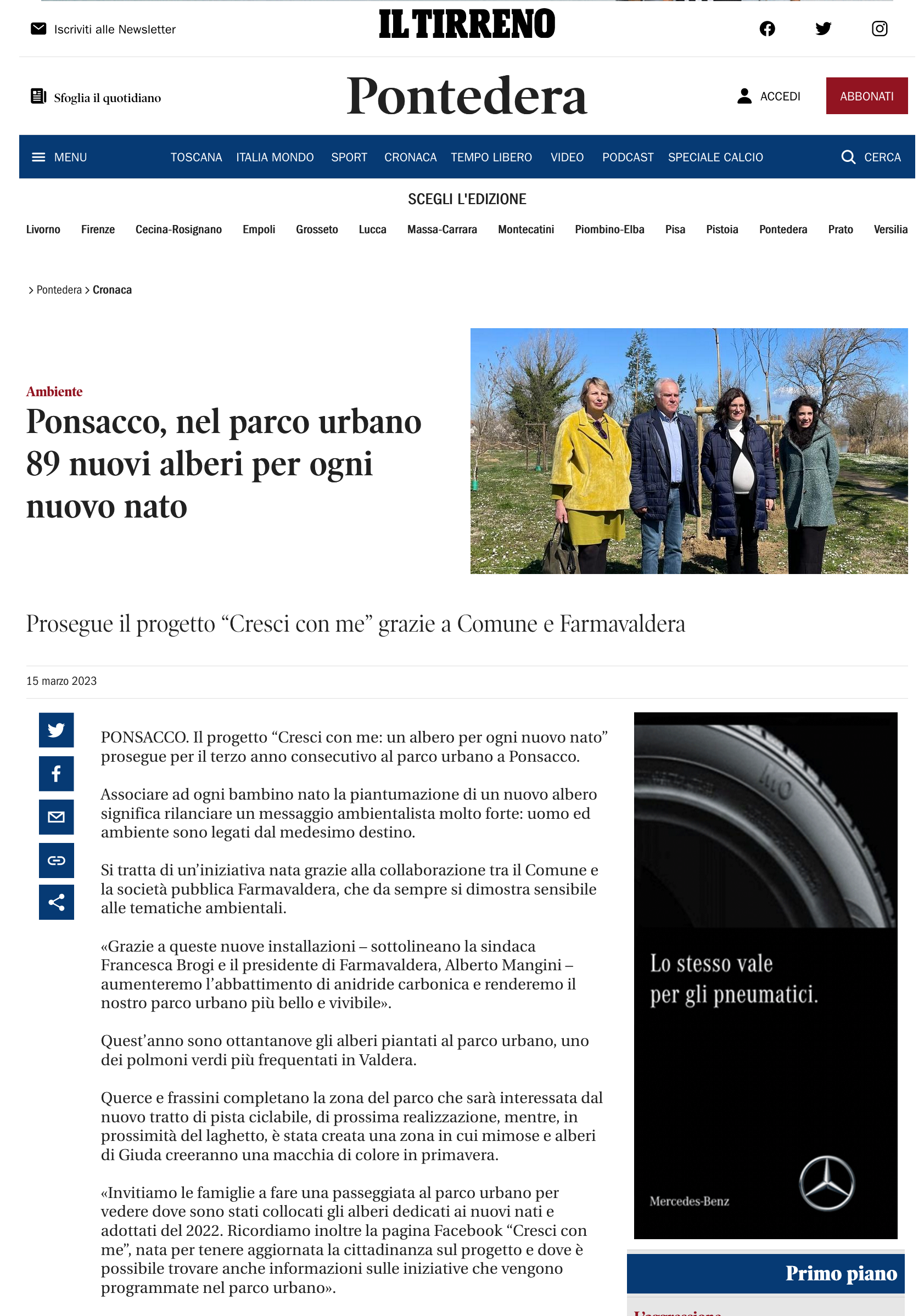 PONSACCO. Il progetto “Cresci con me: un albero per ogni nuovo nato” prosegue per il terzo anno consecutivo al parco urbano a